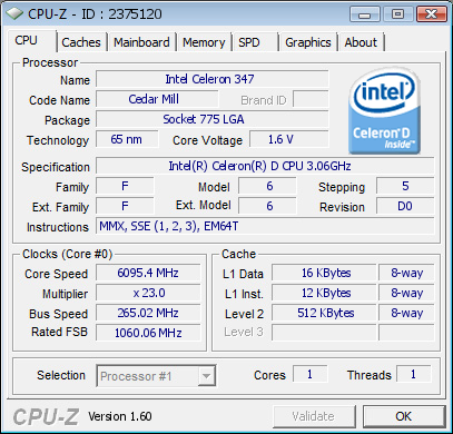 Model Intel Celeron D 347 Cedar Mill-512 Cooling Single Stage Phase Change Cores 6,095 MHz (+98.79%)