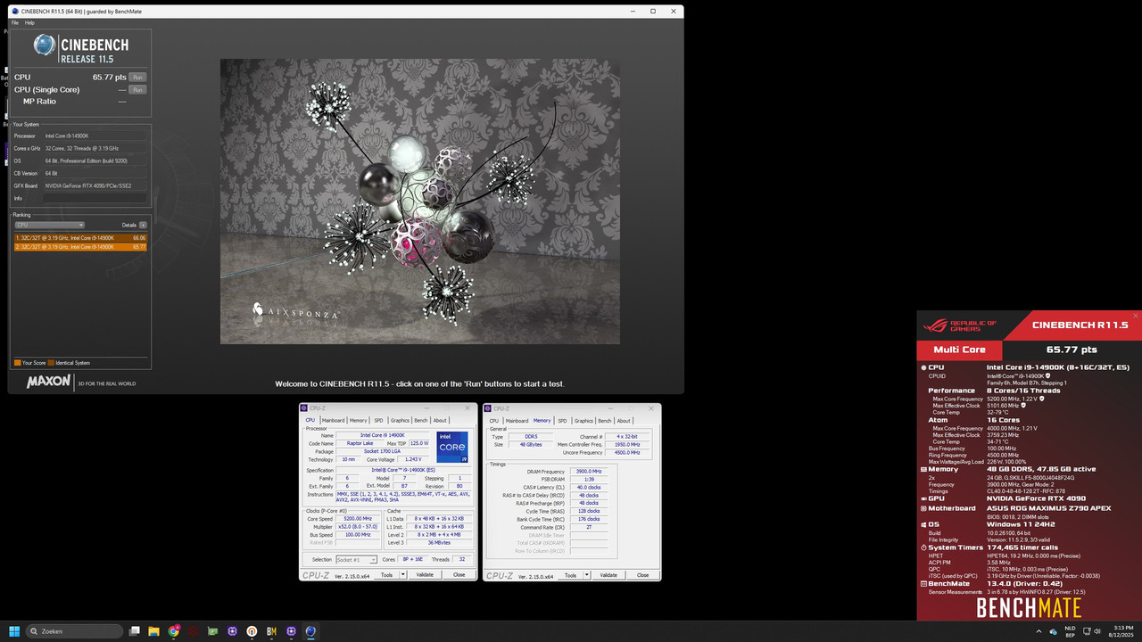 Without BenchMate: Benchmark window, full rendered scene & score CPUZ tab for CPU and memory (V2.00+) With BenchMate: Benchmark window, rendered scene & BenchMate score (BM) CPUZ tab for CPU and memory (V2.00+) |