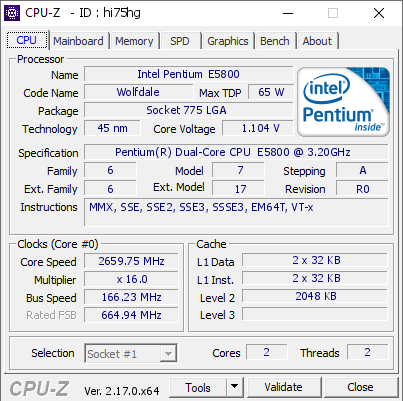 Model Intel Pentium E5800 Wolfdale-2M Cooling Air (Stock) Cores 2,659.75 MHz (-16.88%) REF 166 MHz