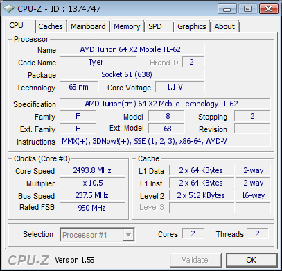 Model AMD Turion 64 X2 TL-62 (Tyler) Tyler Cooling Air (Stock) Cores 2,493.8 MHz (+18.75%)