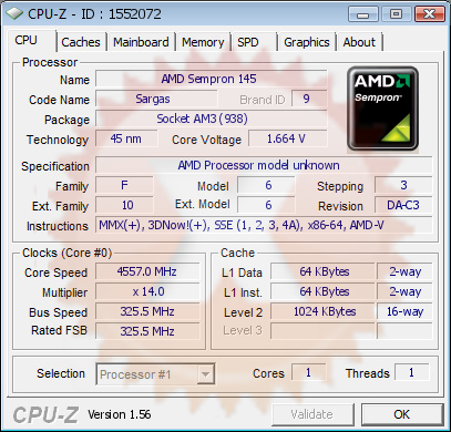 Model AMD Sempron 145 Sargas (1 Cores Active) Cooling Water (Custom) Cores 4,556.98 MHz (+62.75%)