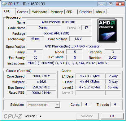Model AMD Phenom II X4 840 Propus (4 Cores Active) Cooling Air (Custom) Cores 4,000.33 MHz (+25.01%)