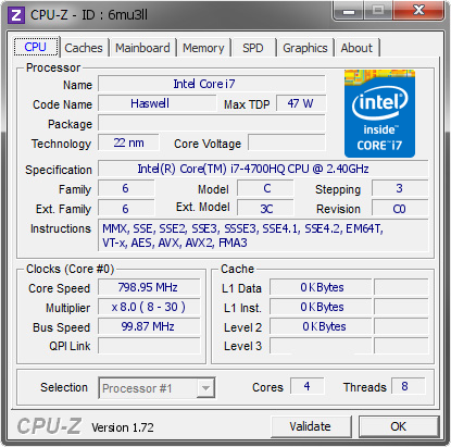 Model Intel Core i7 4700HQ Haswell-H Cooling Air (Custom) Cores 798.95 MHz (-66.71%) REF 100 MHz