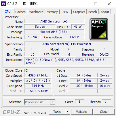 Model AMD Sempron 145 Sargas (1 Cores Active) Cooling Water (Custom) Cores 4,395.97 MHz (+57.00%)