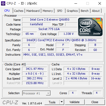 Model Intel Core 2 Extreme QX6850 Kentsfield Cooling Air (Custom) Temperature Load 71 °C Idle 57 °C Ambient 20 °C Cores 3,421.97 MHz (14%)