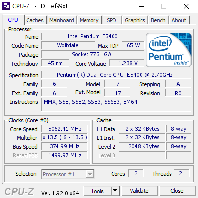 Model Intel Pentium E5400 Wolfdale-2M Cooling Single Stage Phase Change Temperature Load -50 °C Idle -42 °C Cores 5,062.41 MHz (+87%)