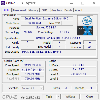 Model Intel Pentium Extreme Edition 840 Smithfield Cooling Air (Stock) Cores 3,199.83 MHz (-.01%)