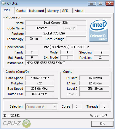 Model Intel Celeron D 336 (2.80GHz, s775) Prescott-256-64 Cooling Air (Custom) Cores 4,306.11 MHz (+53.79%)