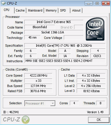 Model Intel Core i7 Extreme 965 Bloomfield Cooling Water (Custom) Cores 4,221 MHz (+31.91%)