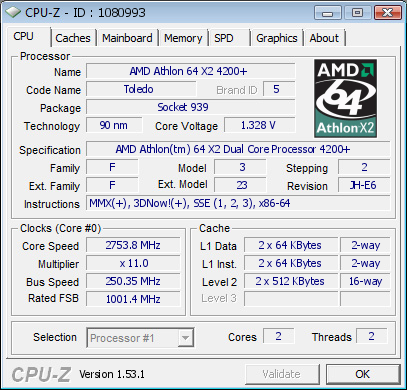 Model AMD Athlon 64 X2 4200+ (Toledo) Toledo Cooling Air (Custom) Cores 2,753 MHz (+25.14%)