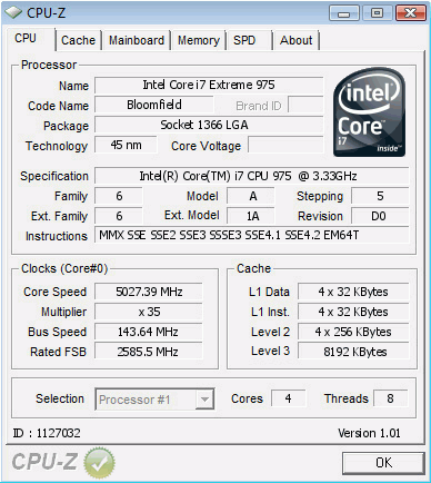 Model Intel Core i7 Extreme 975 Bloomfield Cooling Water (Custom) Cores 5,027.4 MHz (+50.97%)