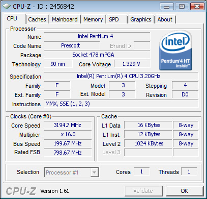 Model Intel Pentium 4 3.2GHz (Prescott) Prescott-1M Cooling Air (Stock) Cores 3,194 MHz (-.19%)